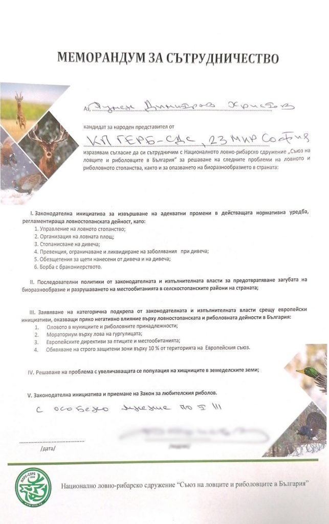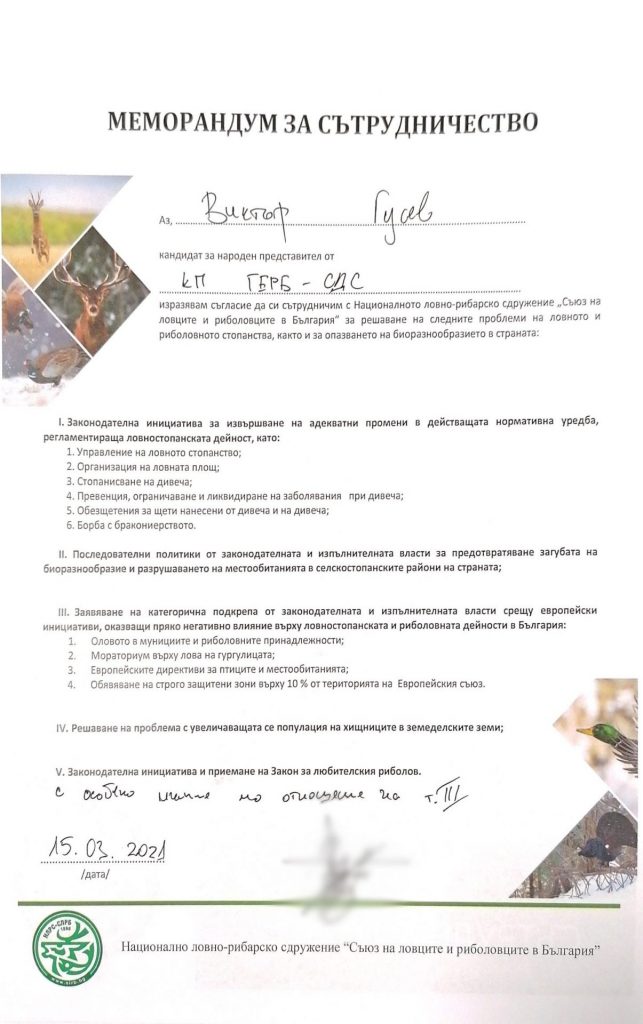 Кандидатите за народни представители от СДС подписаха Меморандум за сътрудничество, с който се съгласяват да работят за решаване на проблемите в областта на ловното и риболовното стопанство. Единствената уговорка, която направиха е, че приемат с особено мнение точка 3 от Меморандума, която се отнася до решения, налагани от Европейската комисия.
