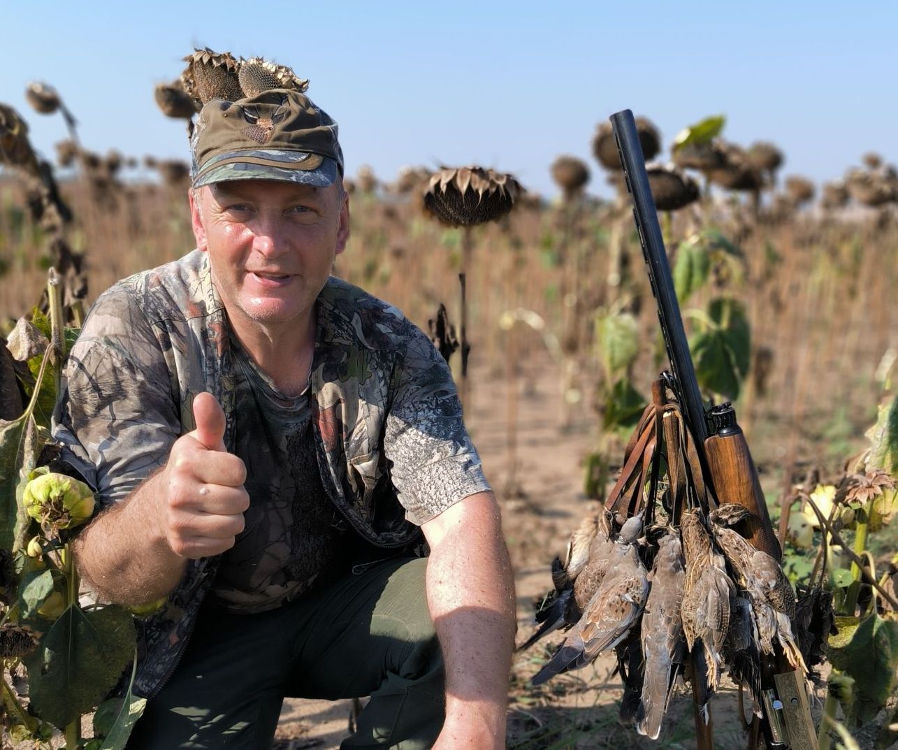 Гургулиците обаче са на обратния полюс. Пръснати и редки птици в огромните слънчогледови масиви. Групират се по 20-30 гургулици, но само на отделни места. Не са повсеместно, както е било в добрите стари времена. Това ги прави още по-плашливи и е изключително трудно да остане незабелязан човек, колкото и стриктен да е в маскировката.