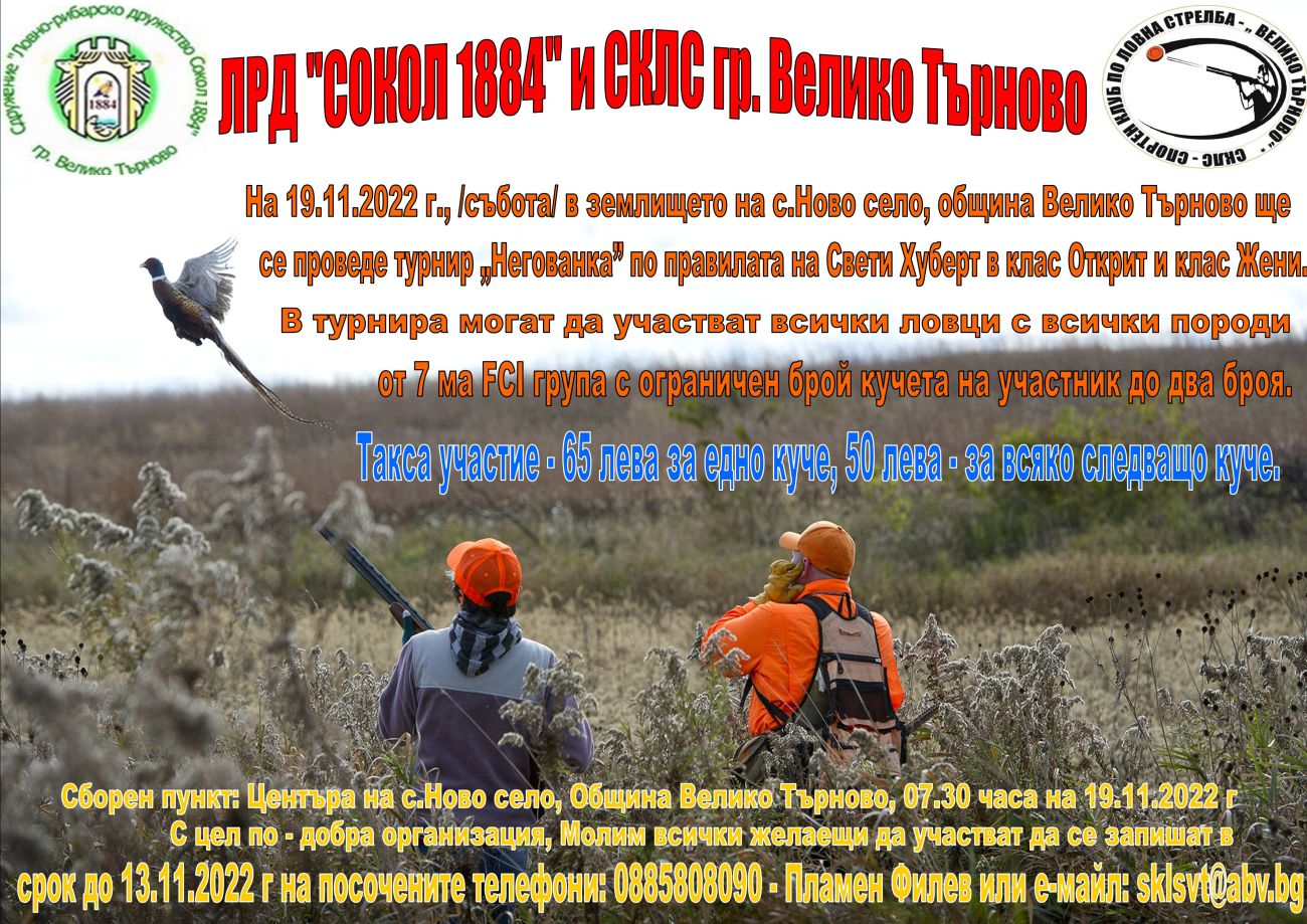 За втора поредна година Ловно-рибарско дружество “Сокол 1884” – Велико Търново и СКЛС – Велико Търново организират турнир за ловци и кучета, работещи със стойка, по правилата на “Св. Хуберт”, които ще се проведе на 19.11.2022 г. в землището на с. Ново село.