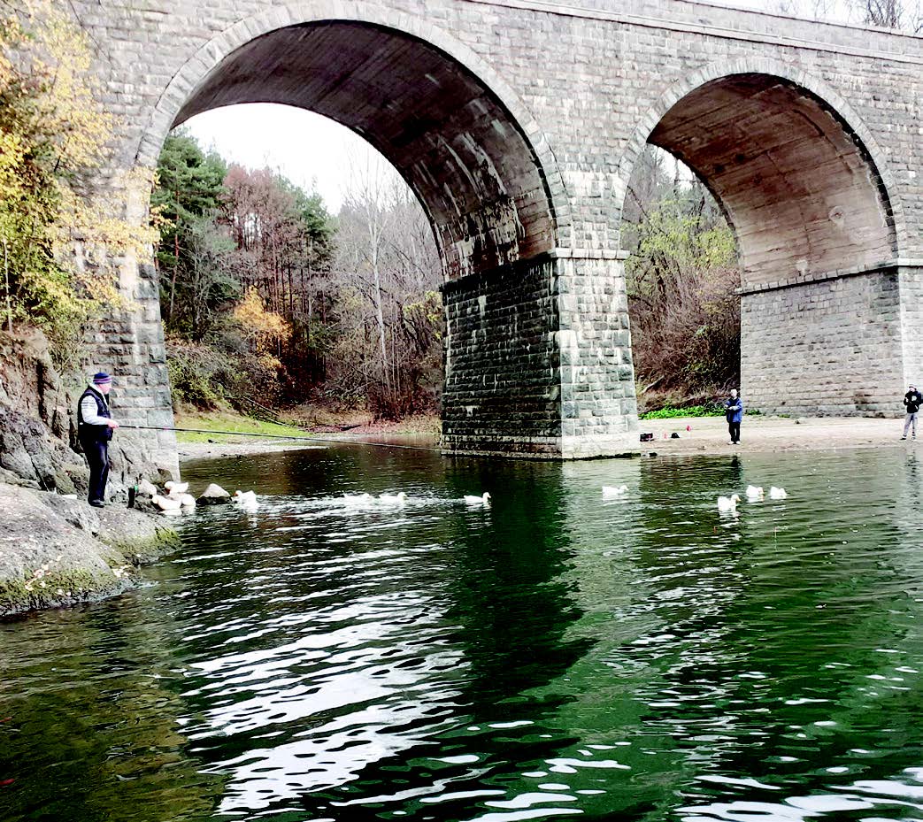 Белите патици не се плашат от хорското присъствие по бреговете, напротив, възползват се от всяка възможност да се нагостят с оставена без надзор захранка и даже се спускат мигновено към мястото, където някой подхвърли храна. Своевременно събират и всяка неориентирана рибка, случайно откачена от въдиците и неуспяла да влезе в дълбокото. Случва се даже да пресекат линиите на заметнати въдици с небрежното си плуване и да създадат допълнителни неприятности на хората, дошли да търсят разтуха с риболов в тези смутни времена.