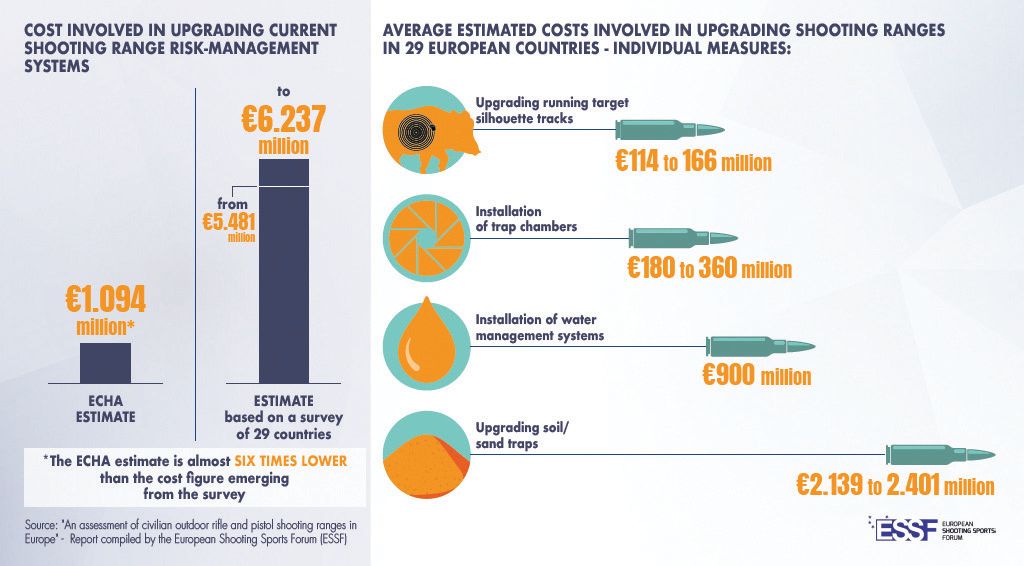Изчислено е, че общата цена на работите по надграждане в тези стрелбищата е между 5,5 и 6,2 милиарда евро, почти шест пъти повече от оценката на ECHA за 1,094 милиарда евро. Голямото различие между оценки на ESSF и тези на ECHA не е изненадващо. Това произтича от ограничените данни на ECHA, предположенията относно съществуващи­те мерки за управление на риска и липсата на отчитане на пълните разходи за надграждане, което включва уловителни камери или пясъчни уловители за улавяне на оловните бое­припаси.