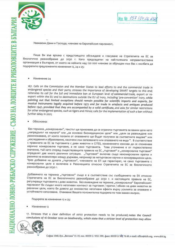 Това беше една от причините за изпращане на писмо до българските евродепутати от страна на НЛРС-СЛРБ. Председателят на организацията инж. Васил Василев подчерта нуждата от защита на горскстопанските дейности, лова и риболова, и обясни защо подобна мярка би имала сериозно негативно отражение върху цели региони в страната, където тези дейности са от първостепенно значение за местното население. В писмото Василев посочи и ролята на ловното стопанство, като инструмент за устойчивото управление на дивата природа, както и алармира, че въвеждането на подобна забрана би противоречала на няколко положителни инициативи на ЕС по отношение на ролята на лова за опазване на биологичното разнообразие, като например инициативата за устойчив лов на ЕС и Европейската харта за лова и биологичното разнообразие съгласно Бернската конвенция.