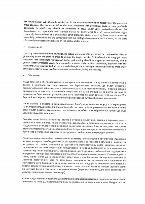 Тезата на Съюза срещна подкрепата на българския евродепутат Андрей Слабаков. В емоционално изказване той подчерта, че налагането по подобен начин на рестрикции, особено за дейности като лова и риболова, прилича по-скоро на връщане към периода на комунизма, отколкото на съвременен подход, отчитащ специфичните нужди на държавите и съответно на местните общности в тях. Той се обърна към евродепутатите така: „Уважаеми колеги, в стремежа си да покажете колко сте загрижени за природата изпадате в крайности, които само ще навредят. Забраната за всякаква дейност… Горскостопанска, ловна или риболовна дейност на територията на Натура 2000 е повече от абсурдна. Изглежда ми странно как политиката ви прави пълен кръг и се връща към интересната стара фраза „Един човек, когато има проблем е трагедия, а когато са един милион е статистика“.“